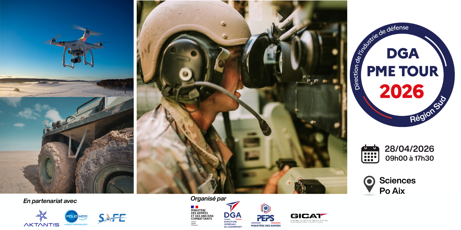 Les pôles de compétitivité SAFE, Mer et AKTANTIS, en partenariat avec la DGA le GICAT organisent une journée PME Tour DGA le 28 Avril 2026 à Sciences Po Aix, un événement qui vise à Cet événement vise à réunir industriels et chercheurs pour favoriser l’émergence de projets d’innovation, le développement business et les opportunités de networking.